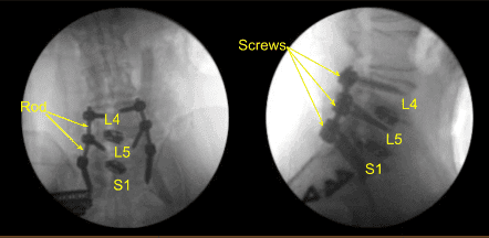 Precut-precontoured titanium rods were selected, contoured further and placed across the tulips from L4 to S1 bilaterally and secured with locking caps which were all final tightened with a torque and anti torque device. AP and lateral fluoroscopy was used to confirm appropriate sizing and positioning of the rods.