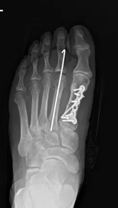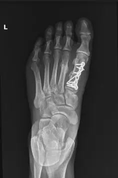Postoperative internal fixation with plate and screws of a fracture of the first metatarsal.