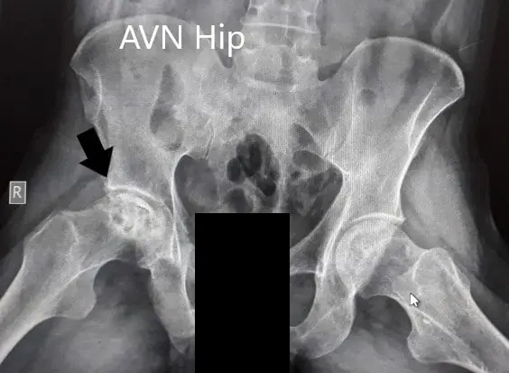 A 38-year-old male presented to our office with complaints of bilateral hip pain (right greater than left) for the last 5 years. The patient had a history of steroid abuse for the past 20 years. He was a professional bodybuilder with a history of non prescribed steroid use since he was 17 years old. He injected himself with anabolic steroids to promote muscle growth.