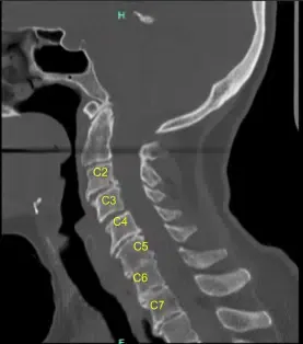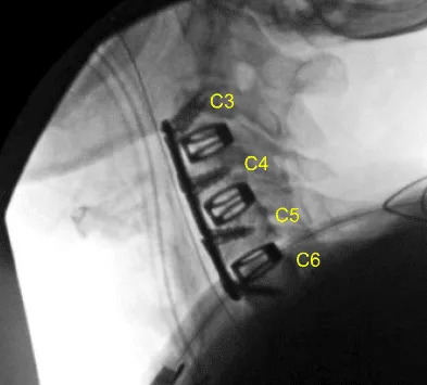 The patient made a full recovery and continued to take part in regular daily activities. A postoperative cervical spine 2 or 3 view x-ray was ordered and the sagittal view is shown below.