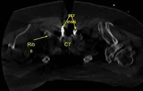 Self-retaining retractors were placed. Hemostasis was obtained with bone wax, Bovie and bipolar cautery. Neuronavigation array was affixed to the spinous process, clamped to the T1 spinous process. The patient was draped. CT scan was obtained, and data transferred to the neuronavigation computer, and accuracy verified.