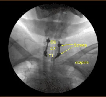 Image-guided stereotactic frame with neuronavigation techniques were used to place the instrumentation. We placed bilateral T1 pedicle screws and decorticated with electric high-speed drill cannulating with the navigated pedicle finder, palpating for breaches, measuring the depths, under tapping by 11 mm and placing 30 mm x 5.0 mm titanium pedicle screws bilaterally without difficulty.