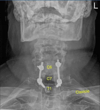 The patient presented to neurosurgery clinic with signs and symptoms of cervical spondylotic myelopathy, cervical stenosis and cervical spondylolisthesis at C7-T1 with lower extremity weakness, loss of dexterity and early signs of myelopathy as well as cord signal changes on the MRI imaging.