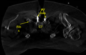 Self-retaining retractors were placed. Hemostasis was obtained with bone wax, Bovie and bipolar cautery. Neuronavigation array was affixed to the spinous process, clamped to the T1 spinous process. The patient was draped. CT scan was obtained, and data transferred to the neuronavigation computer, and accuracy verified.