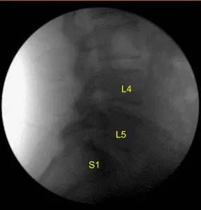 Spinal needle and fluoroscopy were used to localize the L5-S1 level. A midline incision was demarcated. Skin was sterilized with DuraPrep. Sterile drapes were placed in usual manner. 1% lidocaine with epinephrine was infused.