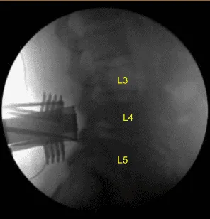 L4, L5 and S1 spinous processes were resected with Horsley rib cutters and Leksell rongeurs. Bone bleeding was controlled with bone wax. Electric high-speed drill with sterile irrigation was used to perform L4, L5 and S1 laminectomy. This was continued with Kerrison rongeurs, carefully protecting the dura. No cerebrospinal fluid or durotomy was identified.