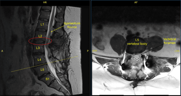 The patient was complaining of pain in both lower extremities. They had a history of L3 to S1 fusion done by another physician. Imaging studies showed good fusion mass from L3 to S1 but compression over L2-L3 segment with bilateral neural foraminal compression of L3 along with bony island formation over L3-L4 region with foraminal compression.