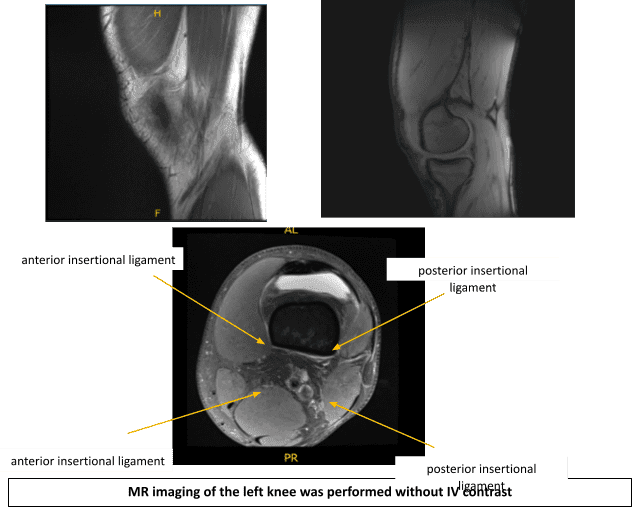 There is complete freedom of knee joint movement. There is no pain in manipulating the patella. There is no crepitation in passive or active range of motion. There is no medial joint tenderness.