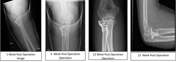 Third week post saw the repair of a complex fracture of the proximal radius in a good position fixed with plate and screws. After a month, early healing of the surgically treated comminuted radial head fracture is noted.