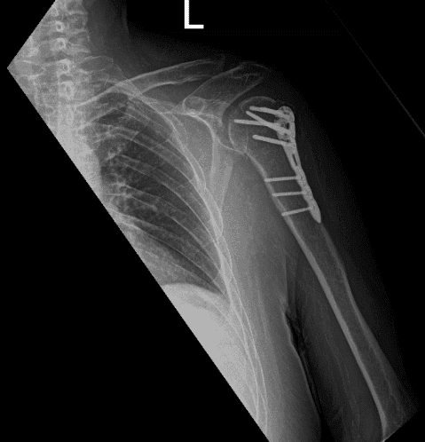 Xray reviewed- found surgically treated comminuted fracture of the humeral head and neck. By this time, we agreed to start Physical therapy.
