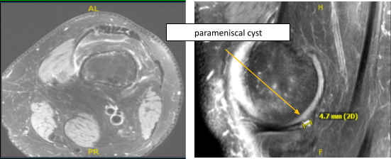 MRI was presented and shown An MRI was provided, which revealed a mild sprain of the medial collateral ligament but no tears. A 0.5 cm para meniscal cyst is linked with a longitudinal vertical tear affecting the outer third of the body and the posterior horn medial meniscus. There was mild fraying of the free border of the lateral meniscus. There was a tiny joint effusion and a lymph node in the popliteal fossae with an unknown etiology.