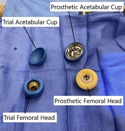 Prueba e implante real (cabeza del fémur y componente acetabular)