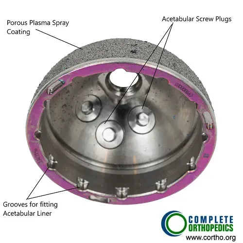 El armazón acetabular puede estar hecho de una aleación de cobalto y cromo, y tiene una cubierta exterior porosa. La cubierta exterior porosa tiene una estructura similar a las trabéculas óseas y favorece el crecimiento óseo. El crecimiento óseo permite una fijación rígida. El armazón acetabular también puede fijarse con tornillos acetabulares cuidadosamente dirigidos en el hueso pélvico para evitar dañar las estructuras neurovasculares. El armazón está recubierto por un revestimiento de polietileno altamente reticulado. El entrecruzamiento se consigue mediante radiación y el polietileno se trata después con antioxidantes para evitar daños por desgaste.