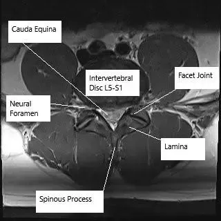 Imagen de resonancia magnética en sección axial que muestra la columna lumbar a nivel de L5-S1.