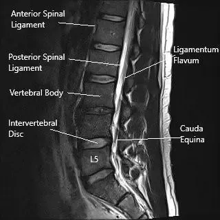 Imagen de resonancia magnética en sección sagital mostrando la columna lumbar.