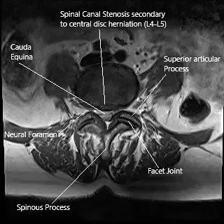 Resonancia magnética de la columna lumbar en una hernia discal central en la sección axial.