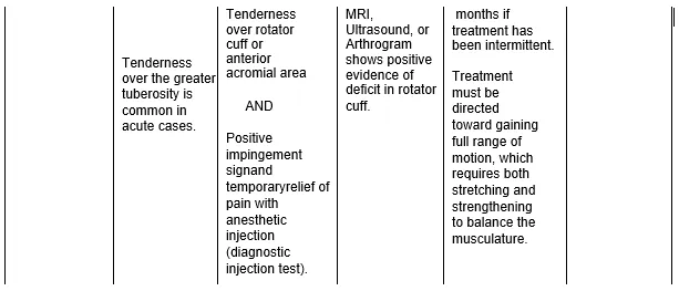 - La abducción, la rotación externa, la rotación interna y la flexión hacia adelante tendrán un rango de movimiento activo restringido y doloroso;