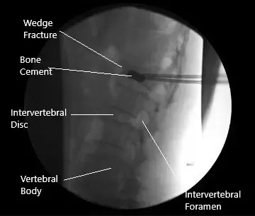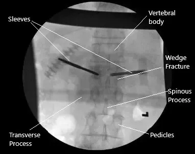 Se mezclaba cemento óseo e insertaba en los lados derecho e izquierdo. Se podían insertar unos 4 cc de cemento. Se sospechaba una ruptura en la placa inferior del extremo, pero el cemento seguía en el cuerpo vertebral. Los tamps se metieron en las mangas hasta que el cemento se endureció. Se quitaron las mangas. La foto final se tomó en la vista AP y lateral y se guardó. La herida fue completamente lavada.