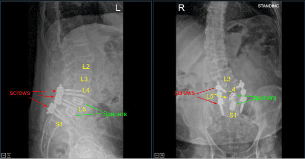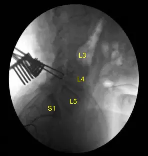 Separadores intersoméricos de titanio expandibles, lordóticos de 15 grados en L5-S1 y lordóticos de 10 grados en L4-5, fueron colocados bajo guía fluoroscópica y ampliados hasta un ajuste adecuado. Hubo un hundimiento parcial del separador intersomático en L5-S1 hacia el cuerpo de L5, pero estaba asegurado y ajustado ajustadamente, y las imágenes mostraron posicionamiento en línea media.