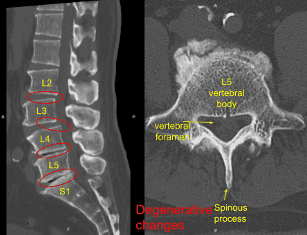 Me hicieron una resonancia magnética que mostró cambios degenerativos de L2 a S1 con retrolistesis en L2-L3, anterolistesis de grado 1 en L3-L4, fenómenos de vacío en L4-5 y L5-S1 con pérdida de espacio discal en L4-L5 y L5-S1.