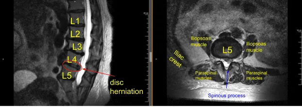 Les realizaron una resonancia magnética (RMi) que mostró enfermedad degenerativa del disco con cifosis de la columna lumbar junto con hernia discal en L4-5 izquierda. Las imágenes se muestran a continuación.