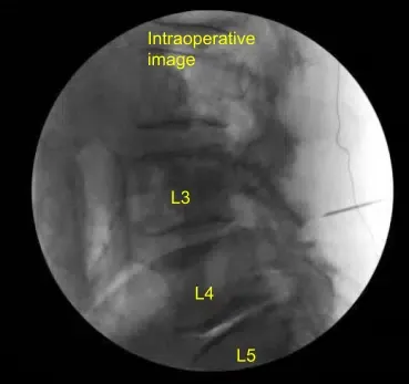Se utilizó la aguja espinal para localizar el nivel L4-L5 en el lado derecho. Se demarcó una incisión lineal de 1,8 cm que se infiltró con anestesia local. La piel se abría con un bisturí de 10 cuchillas. Se obtuvo hemostasia con Bovie y se utilizó Bovie para dividir bruscamente la fascia. Se usaban dilatadores secuenciales para acoplar un separador tubular de 18 mm x 5 cm que se fijaba rígidamente al marco de la cama.