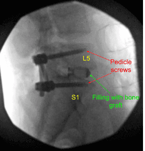 Una vez realizada la disección, se decidió colocar tornillos pediculares en ambos pedículos de S1 y L5. Se utilizaba un taladro para marcar un agujero piloto y una palanca de cambios para guiar el agujero a través del pedículo de S1 a ambos lados bajo guía fluoroscópica. Se utilizaba el sonido de la punta de la bola para comprobar la integridad del canal.