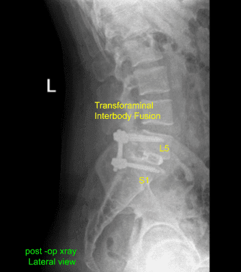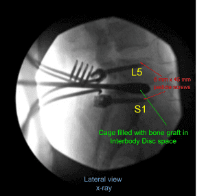 Habíamos hablado de opciones de tratamiento, incluyendo: quirúrgicos y no quirúrgicos, tanto sus riesgos, complicaciones como recuperaciones. Hablamos sobre el uso de implantes en forma de tornillos, varillas y jaulas, así como el uso de biológicos como injertos óseos y sustitutos de su propio hueso, hueso cadavérico, así como derivados no humanos. Hablamos sobre la necesidad de una rehabilitación extensa, la imposibilidad de volver al nivel prequirúrgico, entre otros. El paciente estuvo de acuerdo con el plan, que consistía en una fusión transforaminal intersomática (TLIF) L5-S1 de forma electiva.