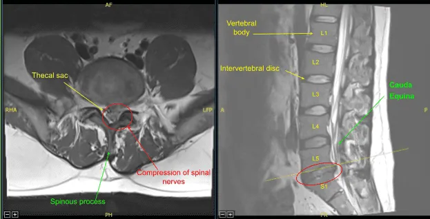 Se realizó resonancia magnética (RM), que mostró una hemilaminectomía previa izquierda en L5-S1. La hernia/extrusión del disco central izquierdo en L5-S1 contribuye al borrado del saco tecal y del receso lateral izquierdo, con estenosis y efecto de masa severa sobre las raíces nerviosas descendentes de S1 izquierda y al menos S2.