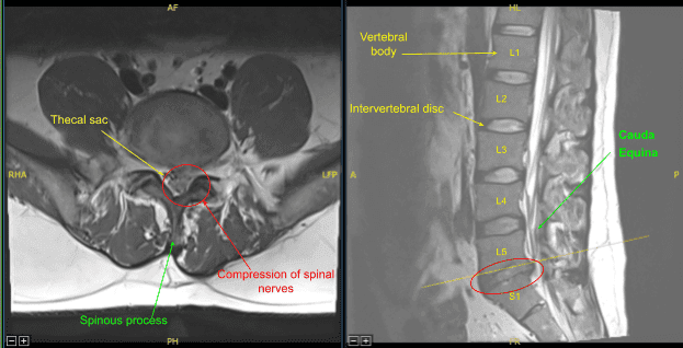 Se realizó resonancia magnética (RM), que mostró una hemilaminectomía previa izquierda en L5-S1. La hernia/extrusión del disco central izquierdo en L5-S1 contribuye al borrado del saco tecal y del receso lateral izquierdo, con estenosis y efecto de masa severa sobre las raíces nerviosas descendentes de S1 izquierda y al menos S2.
