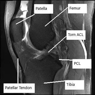 Resonancia magnética de la rodilla en la sección sagital muestra rotura del LCA.