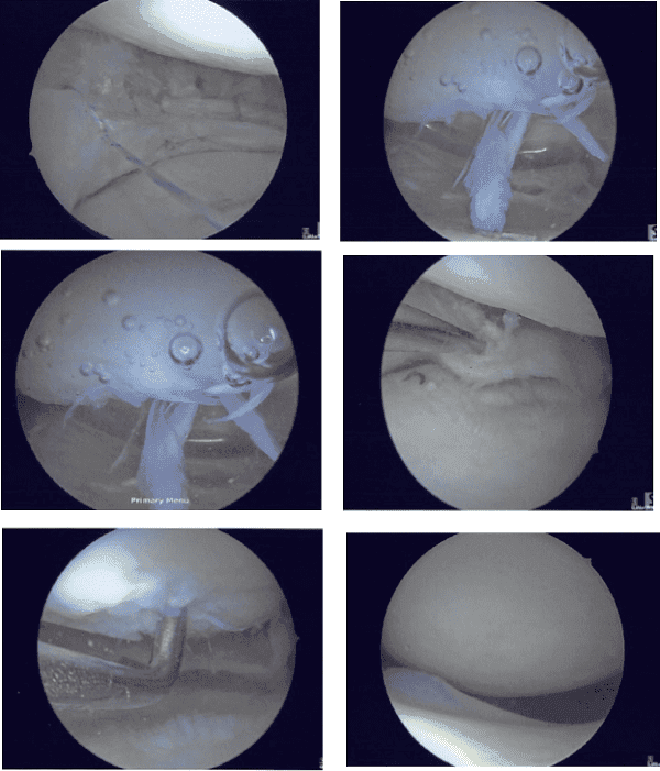 El portal de entrada medial se realizó utilizando una aguja espinal. El examen de la rodilla mostró artritis de troclea grado 3 a 4 de artritis de la troclea, artritis de grado 2 a 3 de la faceta tardía de la rótula, artritis de grado 2 a artritis de grado 3 del cóndilo femoral medial, reparación previa del menisco medial debido a las suturas, así como desgarro largo de la unión meniscocapsular del menisco medial de la rodilla izquierda.