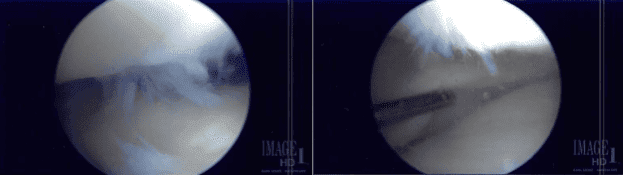 La afeitadora se usaba para eliminar todo el deshilachado y equilibrar el menisco. El endoscopio se introdujo en el compartimento lateral, donde también se encontró que el menisco lateral estaba intacto.