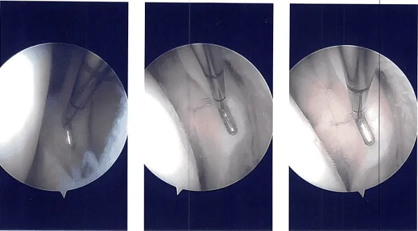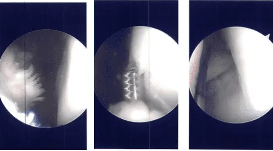 Se construyó un plano entre el poplíteo y el gastrocnemio con los recipientes detrás. El espéculo de Sims se utilizaba para retraer los vasos hacia atrás. Se reintrodujo otro endoscopio en el borde lateral y la reparación integral se realizó usando FasT-Fix con un implante curvo entero interno y suturas curvas Nephew.