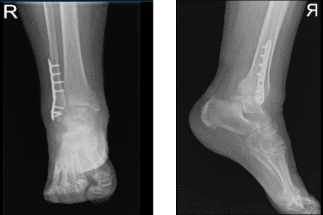 Tras un mes, sugirió al paciente que hiciera una radiografía para comprobar el estado del tobillo operado. El resultado mostró fractura distal fionar antigua y cicatrizada quirúrgicamente. El paciente no ha recibido fisioterapia. Con el seguimiento constante y el procedimiento RICE, los pacientes se recuperan.