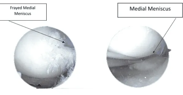 Se introdujo una sonda. Se observó la rotura del menisco medial atravesando el cuerpo y el cuerno posterior hasta la raíz. Se introdujo la afeitadora y se limpiaron los márgenes. Se usaron el mordedor ascendente y el mordedor recto para eliminar el menisco degenerado a lo largo del borde interior del menisco medial. El endoscopio se trasladó a la muesca intercondilar, donde se encontró que el LCA estaba intacto con degeneración.