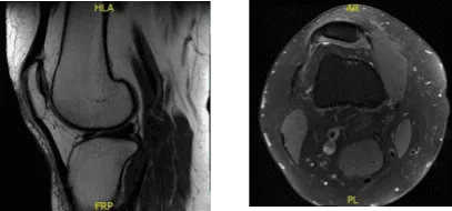 Se realizaron radiografías y resonancias magnéticas en la consulta. Se encontró desgarro vertical en el borde libre del menisco medial del cuerno posterior, con un leve deshilachamiento en la parte inferior inferior/borde libre del segmento corporal. Pérdida condral leve del compartimento femorotibial medial. Desgaste condral leve del compartimento patelofemoral, preferentemente sobre la parte medial del compartimento.