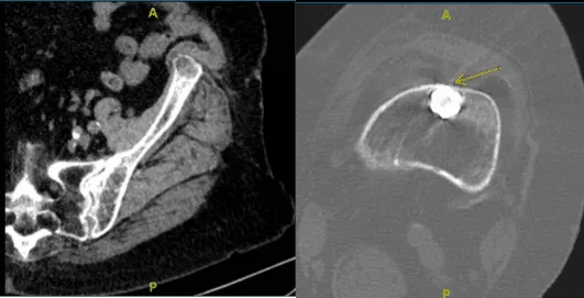 La paciente fue llevada al quirófano, donde la colocaron sobre una mesa de operaciones bien acolchada. Se indujo anestesia general. La bomba se colocó debajo de la cadera izquierda. Se introdujo un brazo en C para asegurarse de que la posición del extremo de la mesa permitiera una imagen adecuada.