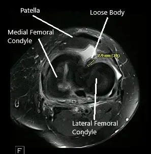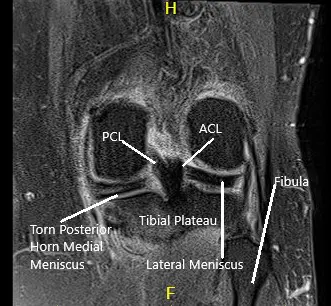 Una resonancia magnética de la rodilla izquierda sugirió osteoartrosis con pérdida de cartílago de alto grado en el compartimento medial y pérdida de cartílago de alto grado cartílago trocleare central con pérdida condral de bajo grado cartílago rotuliano. Gran desgarro radial del cuerno posterior del menisco medial , que está extruido periféricamente. Hay un cuerpo suelto en la parte profunda de la almohadilla grasa de Hoffa que mide 4 mm x 8 mm.
