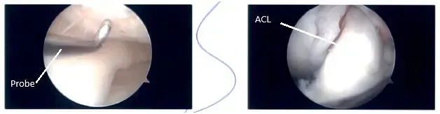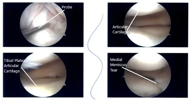 Se construyó un portal de entrada lateral y se accedió al ámbito de la pantalla. Se encontró un desgarro del cuerno posterior del menisco medial. Se construyó un portal de entrada medial. Se insertó la sonda y se volvió a examinar el desgarro. Se encontró una avulsión radicular en el cuerno posterior del menisco medial.