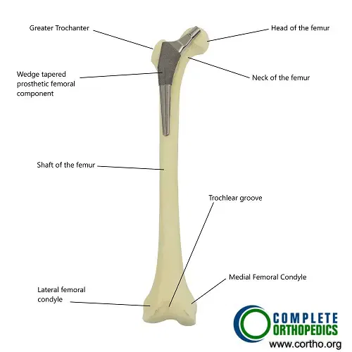 Normal hip anatomy and position of femoral stem in hip replacement surgery.