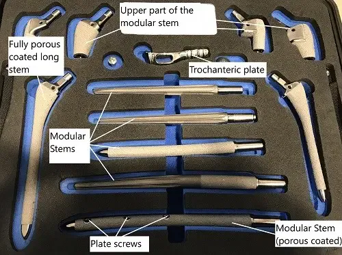 Various revision hip replacement implants.