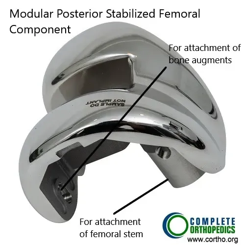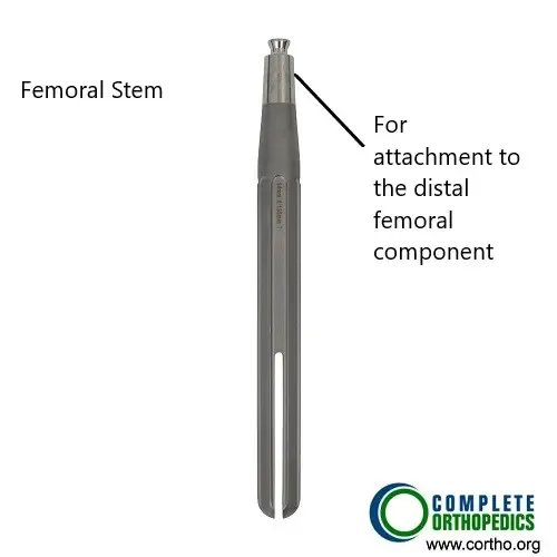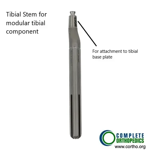 The modular components are used in revision knee replacement and complex knee replacement surgery. The components allow the surgeon to make intraoperative changes to achieve greater stability according to the patient’s anatomy and bone loss. The stem attaches to the upper part of the modular femoral component. While the femoral component is cemented to the lower part of the thigh bone, the stem is not cemented.