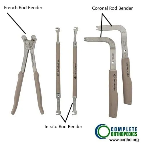 The images above show various types of instruments used in posterior spinal fusion which may be used for revision surgery. The rods are used to stabilize the spinal segments and are tightened over the pedicle screws. The rods may be contoured to a required shape during the surgery to achieve maximum stability using the rod benders.