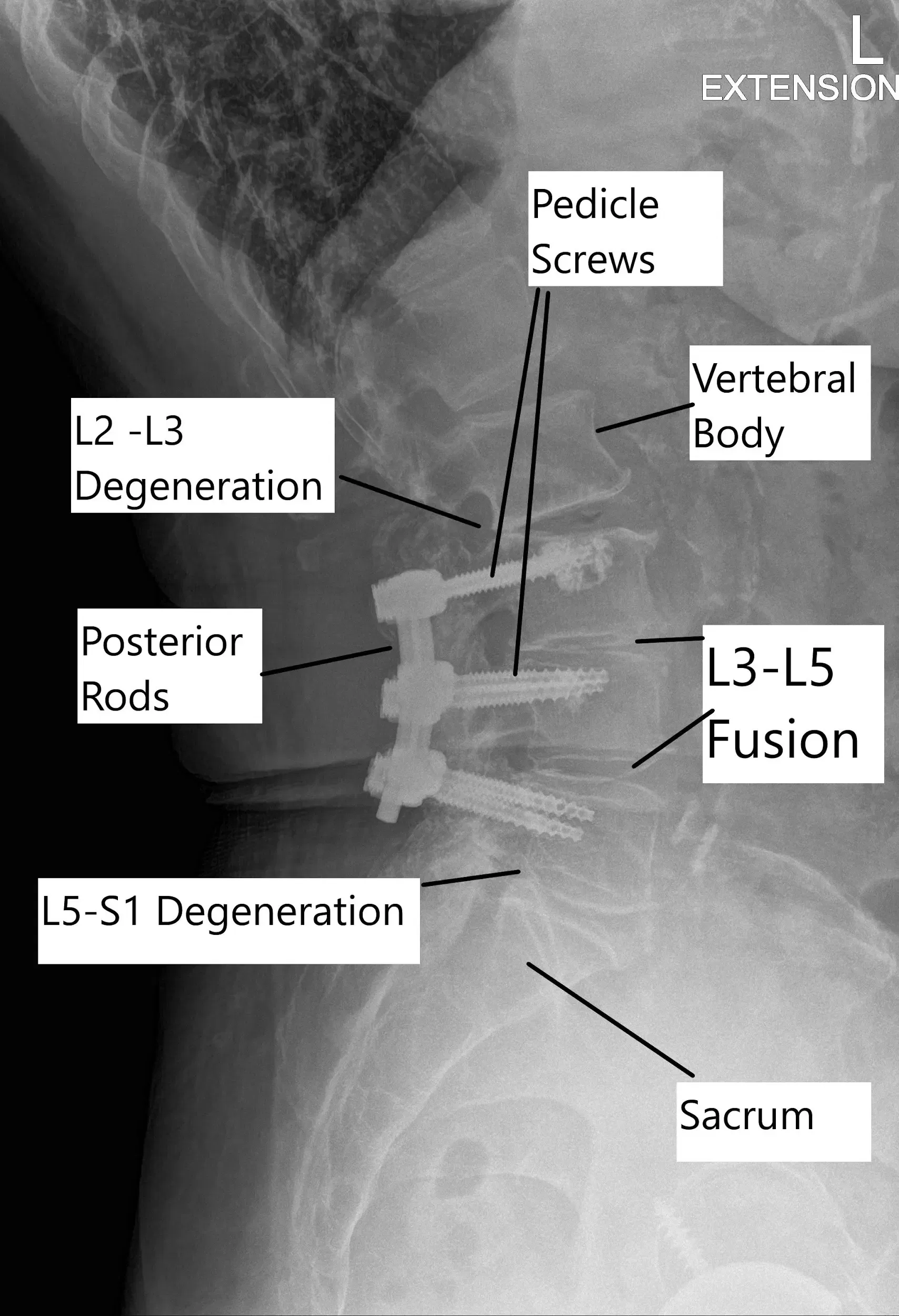 Status post L3 to L5 fusion with adjacent segment degeneration of L2-3 and L5-S1 on X-ray.