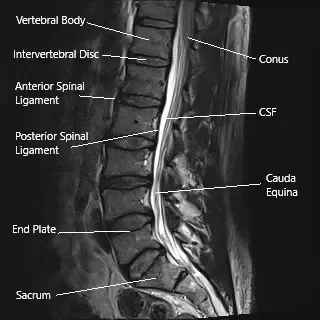Sagittal section of the lumbar spine on an MRI.