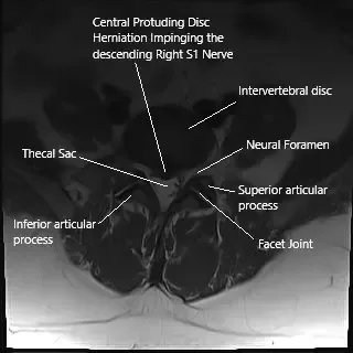 Axial section of the spine on MRI showing herniated intervertebral disc.