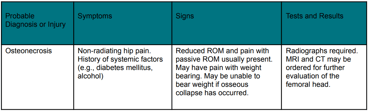 - MRI for Diagnosing OsteonecrosisMRI for Diagnosing Osteonecrosis is recommended for subacute or persistent hip pain presumed to be caused by osteonecrosis, especially if the diagnosis is undetermined or if further testing and/or staging are required.Frequency/Dose/Duration: typically one assessment. If there is a substantial clinical change or the need to assess progress or resolution, a second assessment may be necessary.Rationale: When it comes to detecting bone collapse, helical computed tomography is thought to be superior to MRI. For imaging bone marrow edema, which is inversely linked with prognosis, MRI is thought to be preferable. As a result, each test has benefits.
