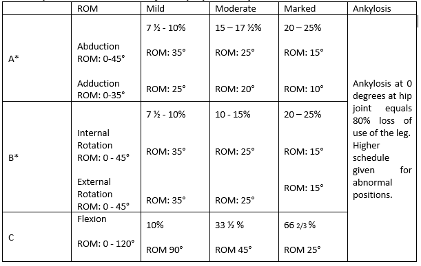 First, evaluate whether any special circumstances need to be taken into account before calculating the total timetable loss of hip use. If not, add abduction/adduction (A) + internal/external rotation (B) + flexion (C), to the extent there are deficits in these ranges of motion, to calculate the overall schedule loss of hip usage. As noted below, other deficits may be taken into account. The schedule cannot exceed the value for ankylosis when evaluating based on range of motion.