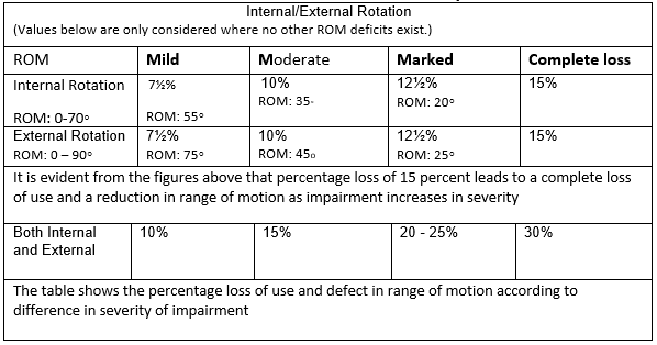 - To avoid cumulative values, do not add slight rotational internal and exterior deficits. Add 10-15%, but not more than ankylosis, for clearly noticeable rotational impairments and muscular atrophy.